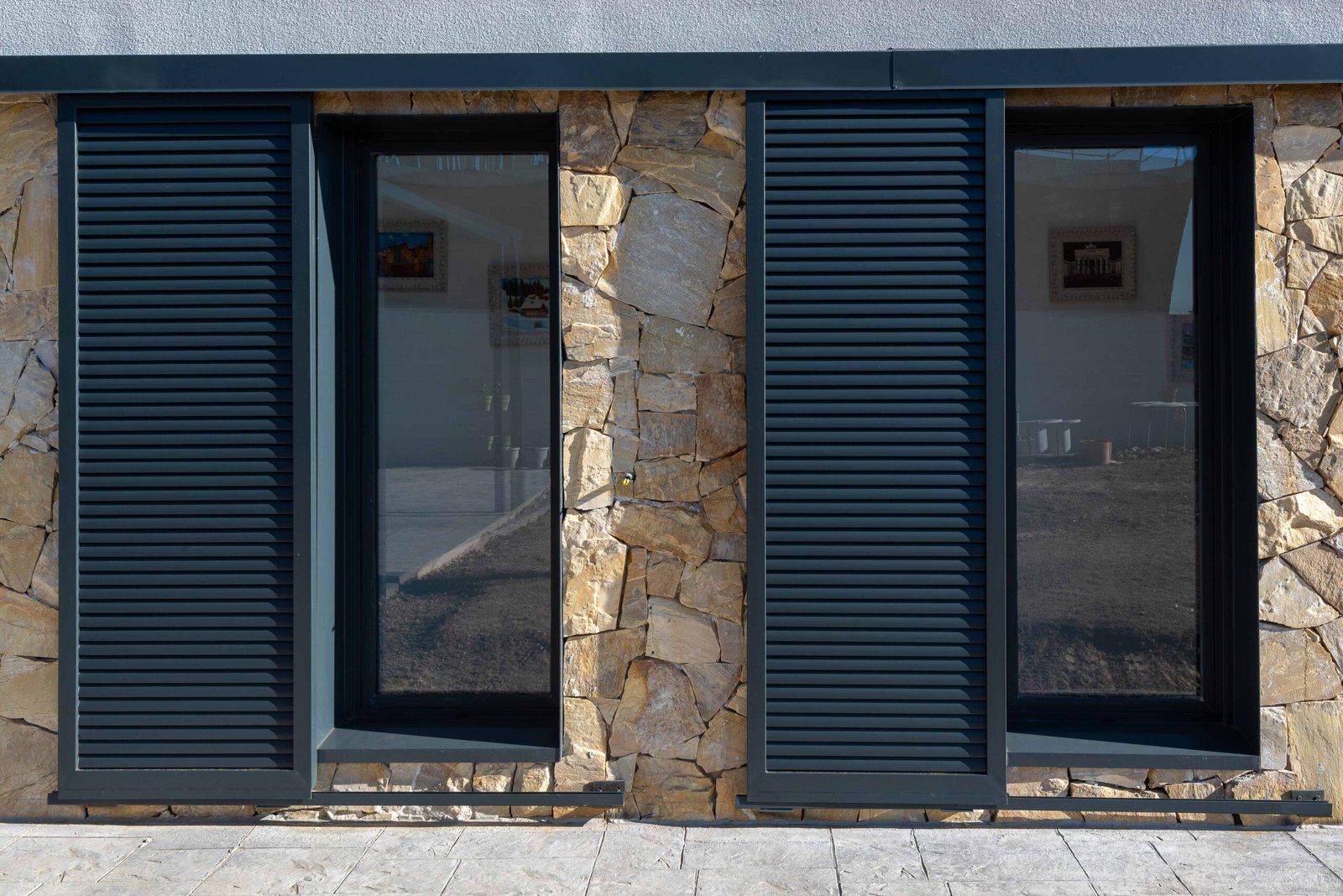 El diseño combina líneas modernas, cubiertas inclinadas de chapa, acabados en piedra natural y una fachada blanca que resalta con carpinterías oscuras y madera natural en la entrada.