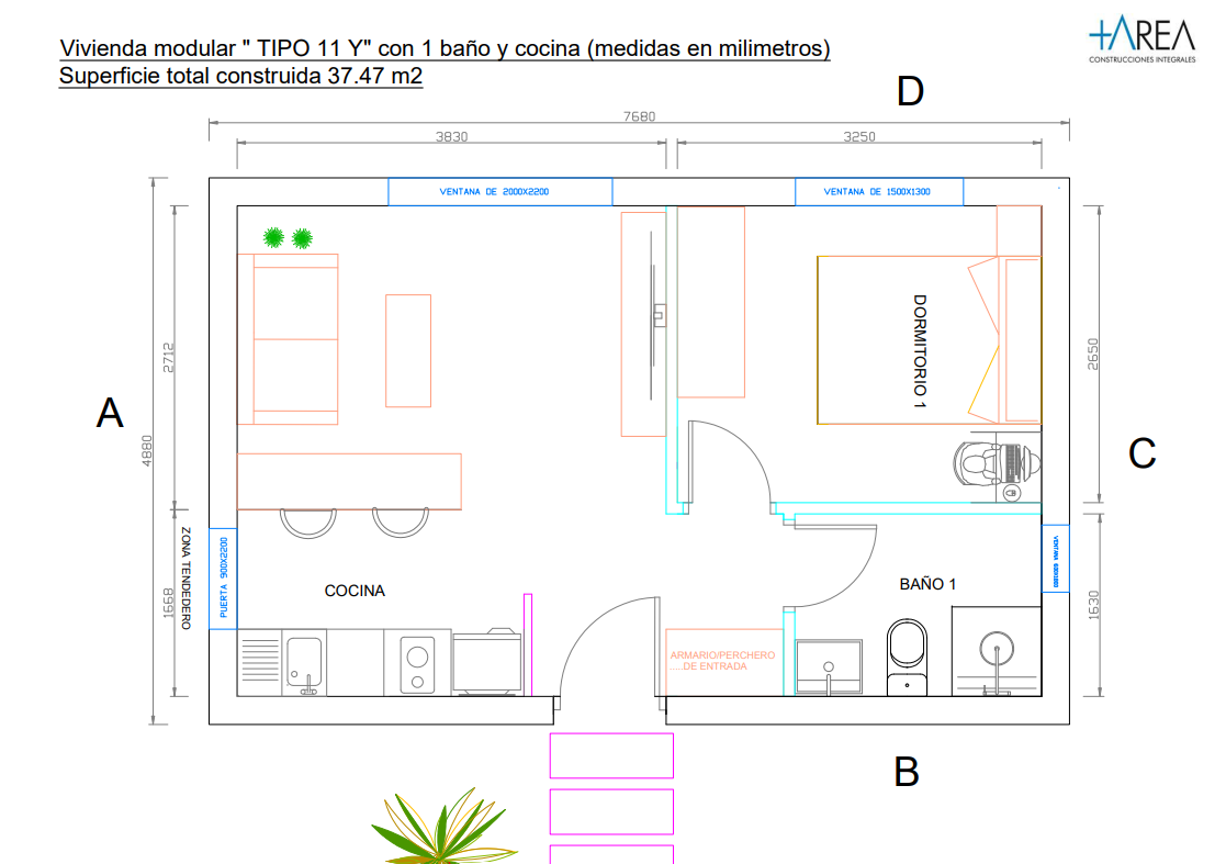 Con una superficie total construida de 37.47 m², este modelo ofrece una distribución limpia y funcional. Al ingresar, se encuentra una cocina lineal totalmente equipada, con espacio para frigorífico, fregadero, zona de cocción y almacenamiento, acompañada de una barra con taburetes para desayunos o comidas rápidas.