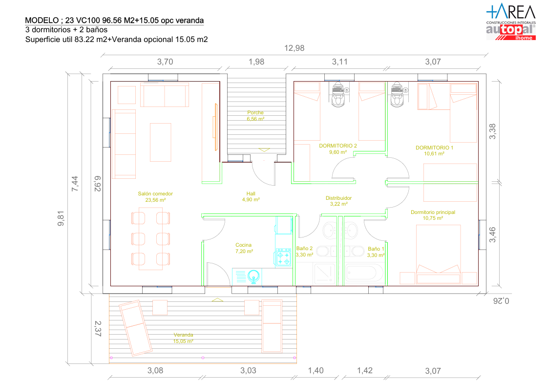 Esta casa destaca por su gran salón comedor, cocina independiente y una distribución que ofrece privacidad en la zona de dormitorios. Además, cuenta con una veranda opcional que amplía el área social hacia el exterior, perfecta para reuniones o momentos de relax al aire libre.