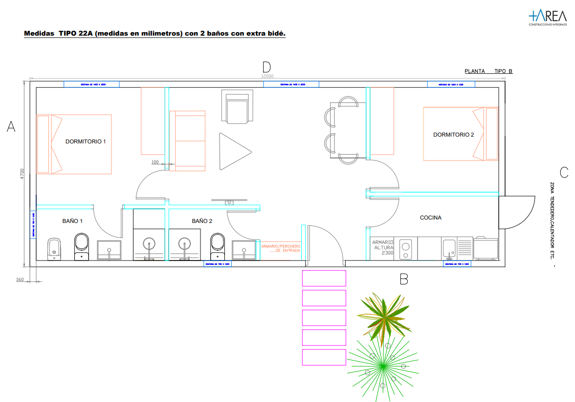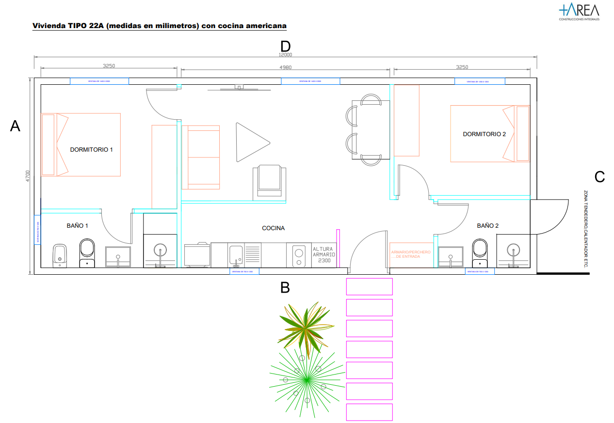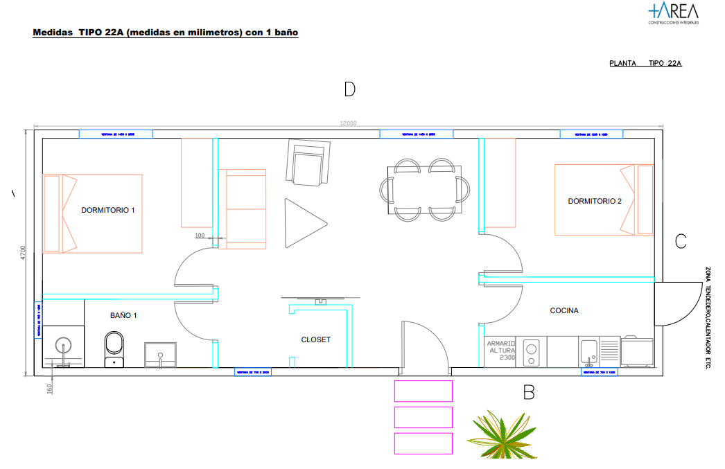Este modelo presenta una distribución lineal optimizada para maximizar el uso del espacio dentro de una planta rectangular de 12 m de largo por 4,7 m de ancho. Cuenta con dos dormitorios y dos baños, integrando la cocina al área social con un concepto de cocina americana abierta.