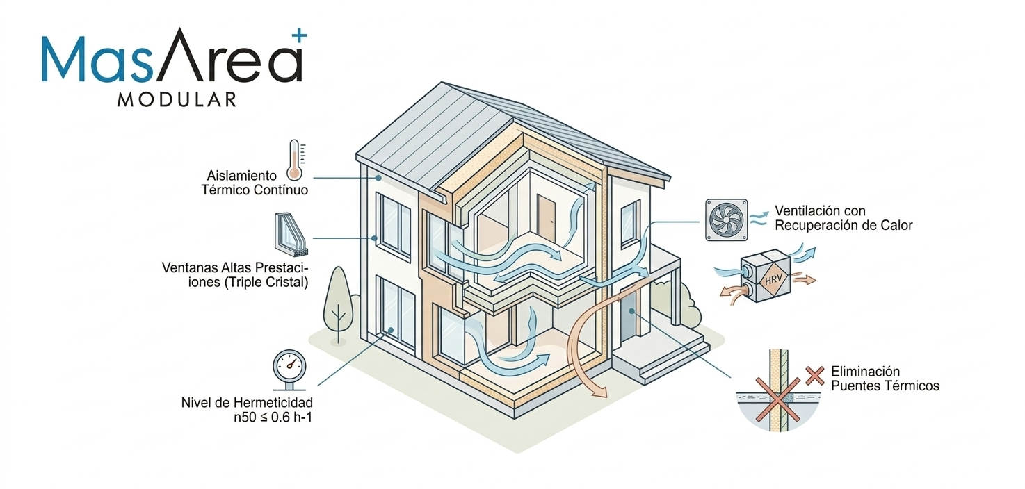 Una vivienda construida bajo este estándar puede reducir hasta un 90% su demanda energética en comparación con una edificación convencional, manteniendo una temperatura interior estable durante todo el año con un consumo mínimo de calefacción y refrigeración.